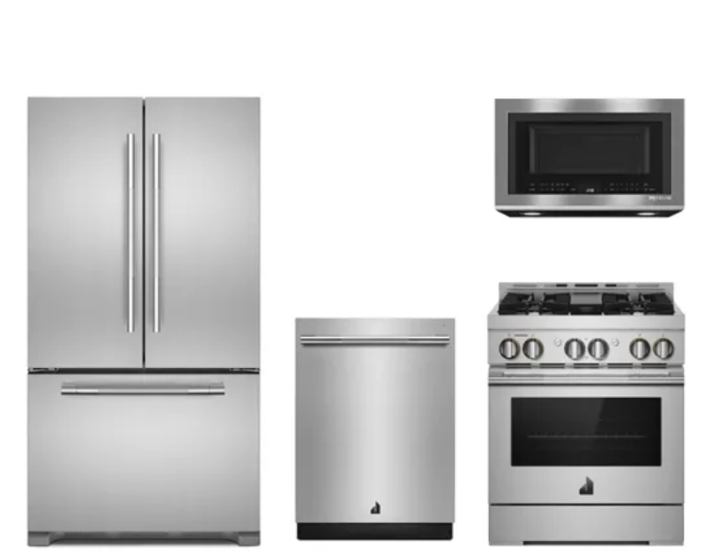 JennAir® RISE™ 4 Piece Kitchen Package-Stainless Steel with a counter depth french door refrigerator, pro style gas range, built in dishwasher and over the range microwaveRead More